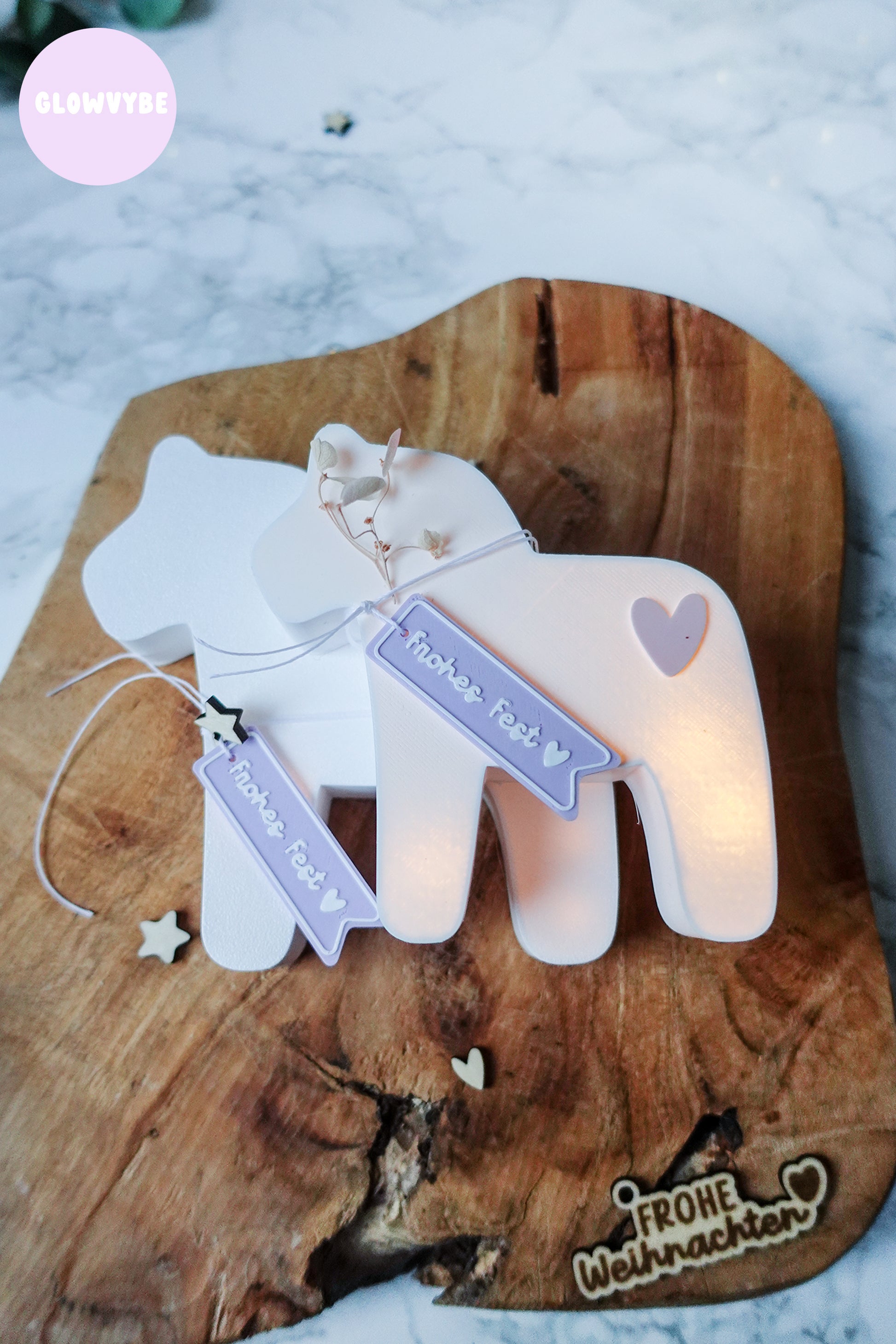 Du erhältst beide Varianten als STL und 3MF Datei – ideal für deinen 3D-Drucker, egal ob Ein- oder Mehrfarbendruck. Als kleines Extra ist der filigrane „Frohes Fest“-Anhänger ebenfalls enthalten – ein süßer Bonus, den du an dein Pferd hängen oder separat verschenken kannst.