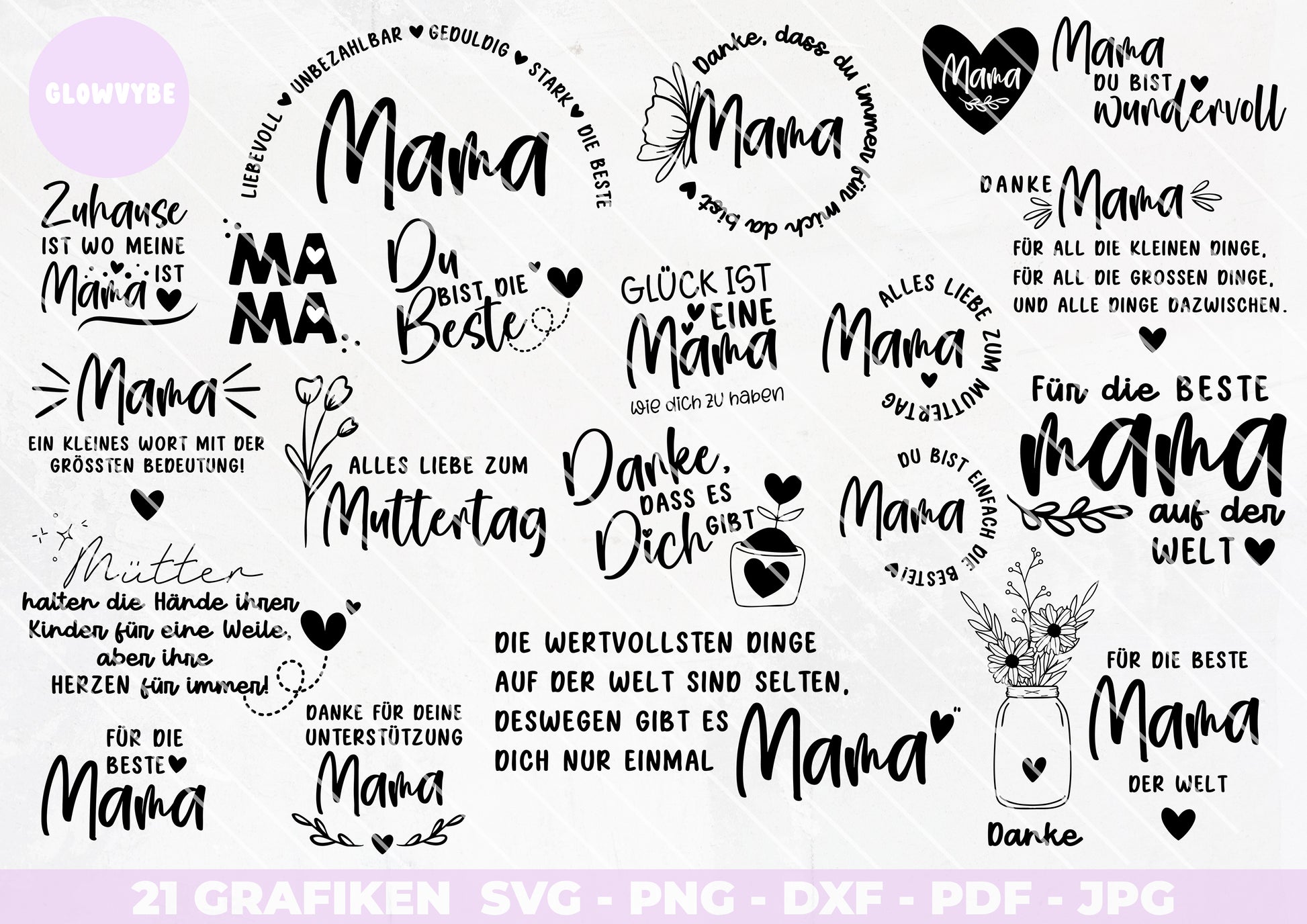 Du suchst nach wunderschönen Plotterdateien für Muttertag? Dieses Bundle mit 21 einzigartigen SVG-Grafiken ist perfekt für dich! Ob für Karten, T-Shirts, Tassen, Holzschilder oder Deko-Projekte – diese liebevoll gestalteten Designs lassen sich vielseitig verwenden.