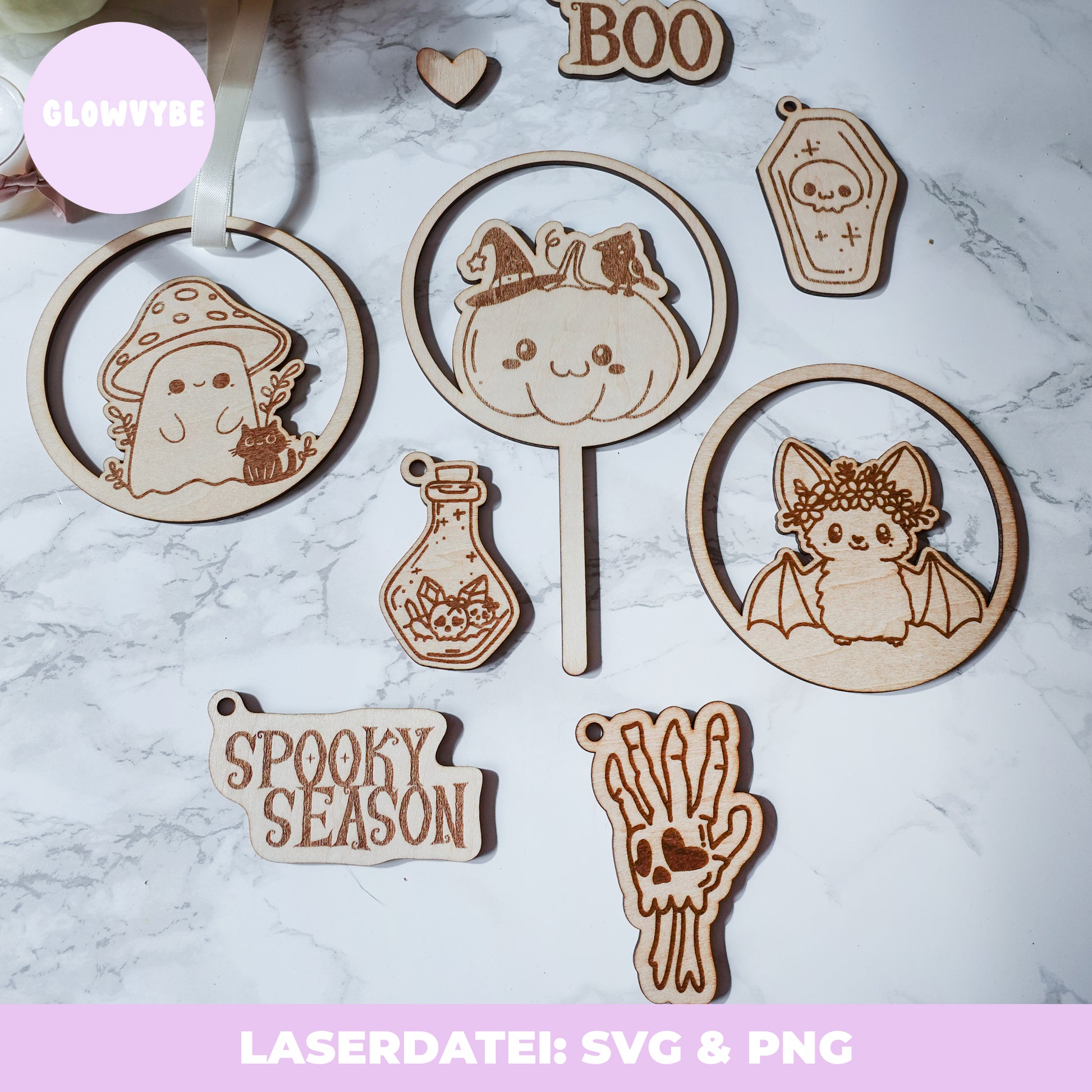 Die hochwertigen Laserdateien sind vielseitig einsetzbar – von dekorativen Loops über Stecker bis hin zu kleinen Anhängern für Schlüsselbunde, Boo Baskets, Geschenkverpackungen oder Sets für Märkte und Shops.