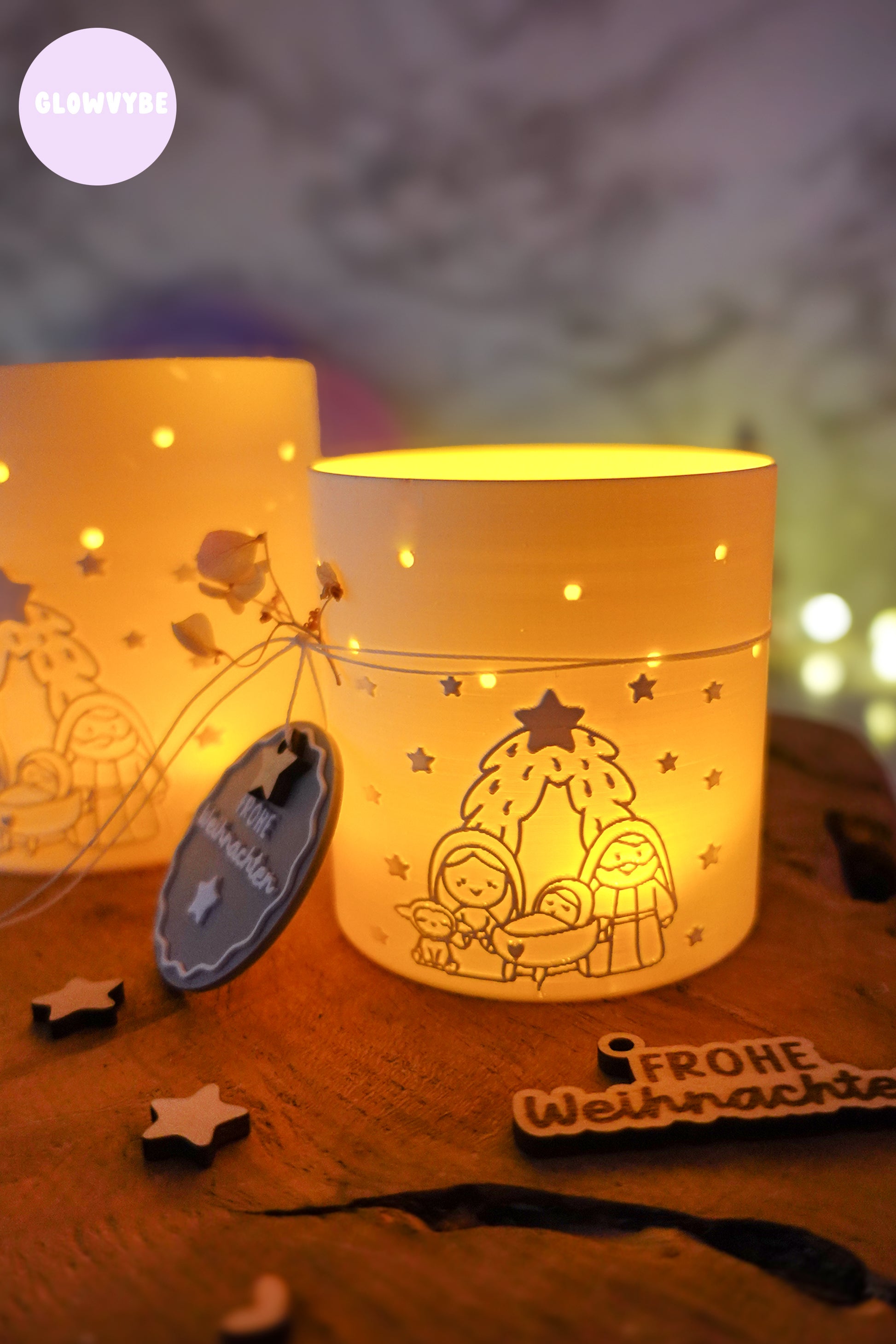 Windlicht „Kleine Stille“ | 3D Druck Datei Weihnachten | STL + 3MF Krippenmotiv mit Frohe Weihnachten Anhänger