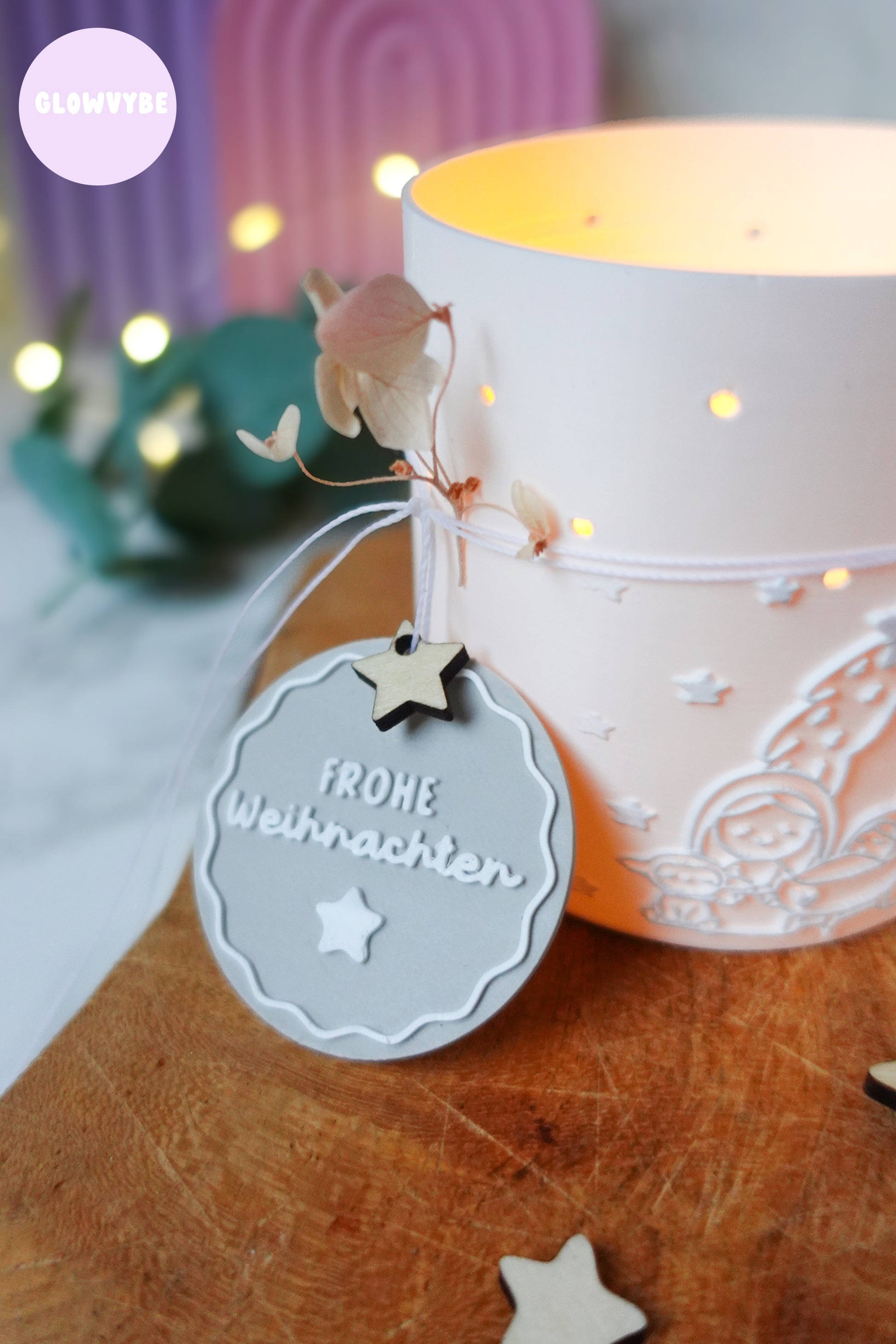 Das Design verbindet moderne Schlichtheit mit warmem Weihnachtszauber. Besonders schön wirkt das Windlicht, wenn du es mit einer LED-Kerze oder einer kleinen Lichterkette beleuchtest. So entsteht ein harmonisches Lichtspiel, das Herz und Augen gleichermaßen erwärmt.